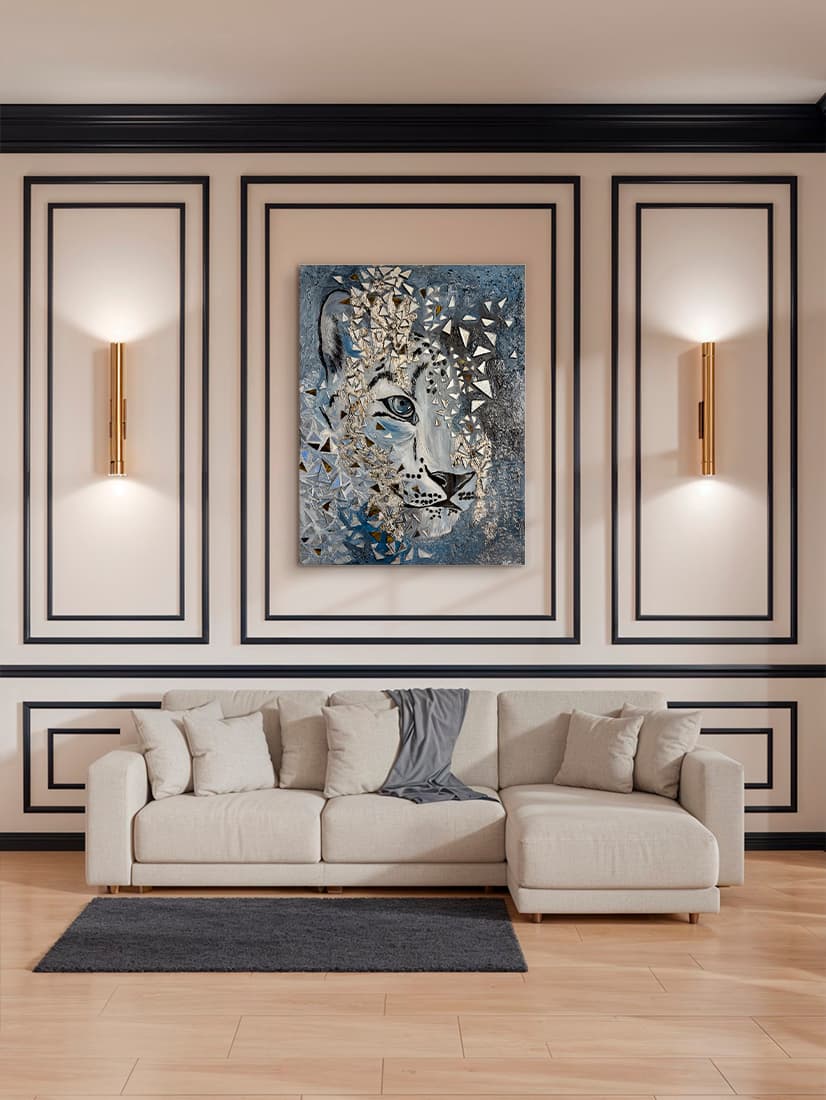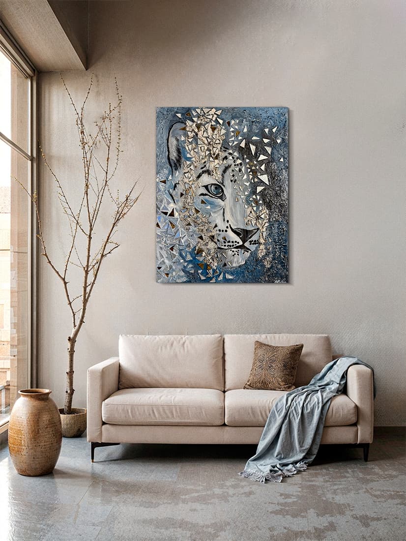 The mirrored mosaic and gold leaf in the composition symbolize the soul's multidimensionality and the light that breaks through inner layers. Pure quartz lends the work energetic purity and clarity, intensifying the sensation of spiritual insight. Textural paste and the contrasting black-and-white tones of the leopard emphasize the harmony of opposites unified in a single cohesive image — both in nature and in the human soul.