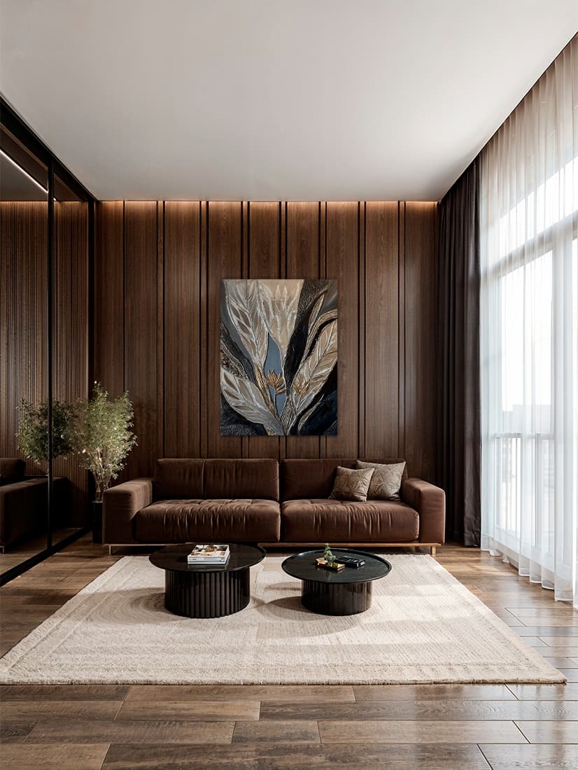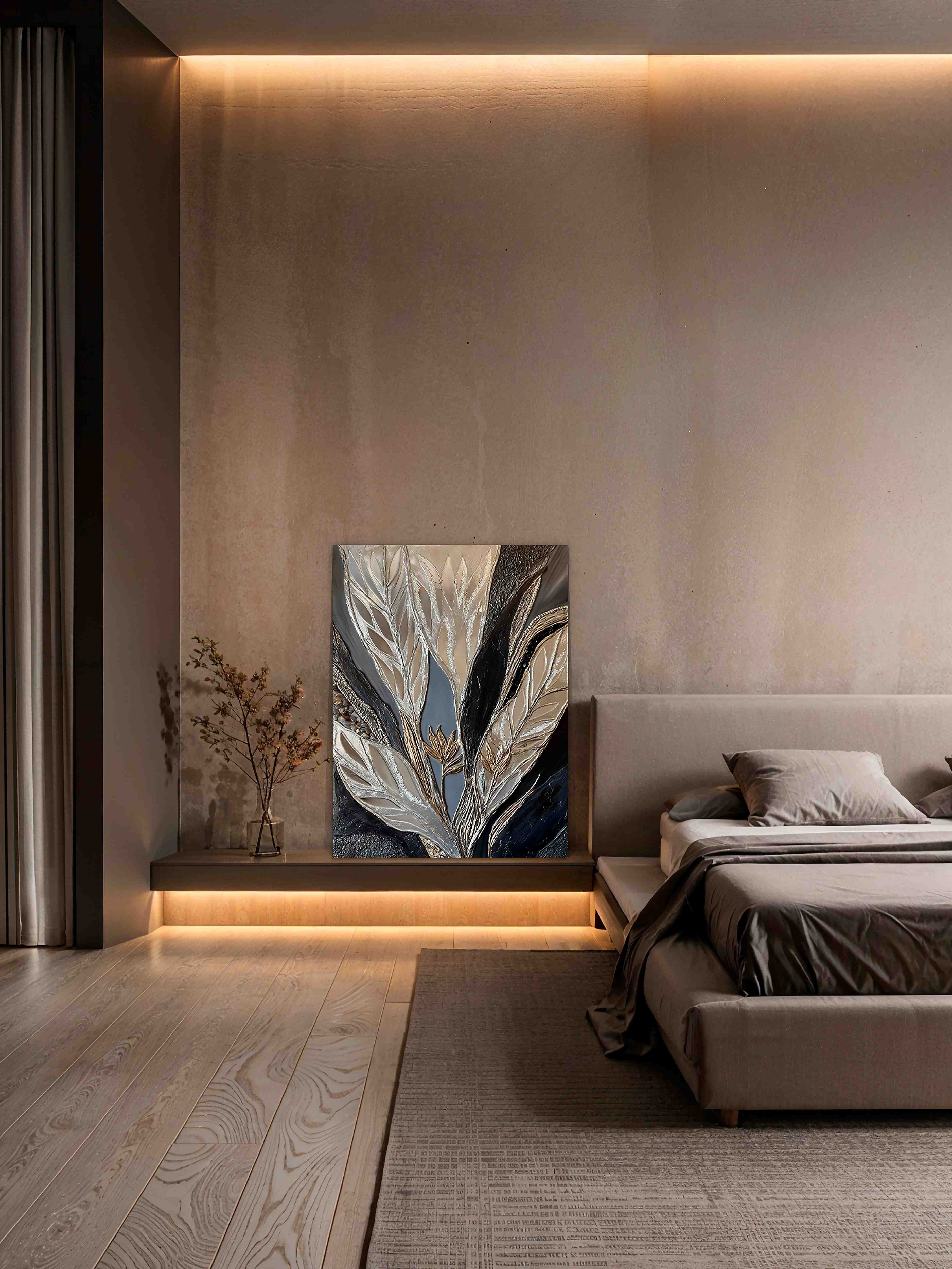 This painting is about the fragile boundary between reality and illusion, about the search for meaning in a world of multiple reflections. Here everything is interwoven: the stone’s texture, the shimmering gold leaf, the mirrored surfaces.